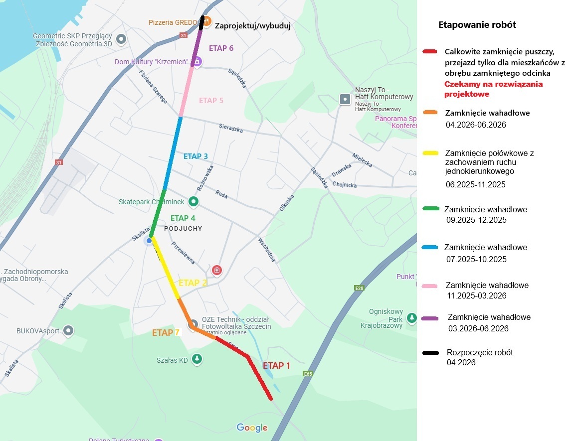 I Etap realizacyjny – „Przebudowa ulicy Krzemiennej w Szczecinie w zakresie włączenia ul. Krzemiennej w DK nr 31” - w formule zaprojektuj i wybuduj. Wlot ul. Krzemiennej stanowić będzie początek obszaru uspokojonego ruchu, na którym będzie obowiązywało ograniczenie prędkości do 30 km/h. Zmieni się geometria wlotu ul. Krzemiennej w celu dostosowania do przejazdu autobusu z umożliwieniem wyjazdu z obszaru skrzyżowania samochodu osobowego. W tym celu w centralnej części wlotu wprowadzono wyspę centralną, w poziomie jezdni dla rozdzielenia kierunków ruchu pojazdów osobowych, umożliwiająca przejazd pojazdom ciężarowym oraz autobusom komunikacji miejskiej. Wykonane zostaną ponadto chodniki. Przebudowane zostaną sieci w tym wykonane zostanie odwodnienie. Zagospodarowana zostanie zieleń.